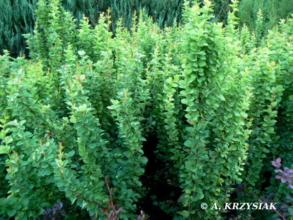 Wąski, krzew z wyprostowanymi pędami. Osiąga 1,5 m wys. Jasnozielone liście, jesienią przebarwiają się na purpurowo. Kwiaty żółte w V. Nie ma szczególnych wymagań. Doskonała roślina żywopłotowa.