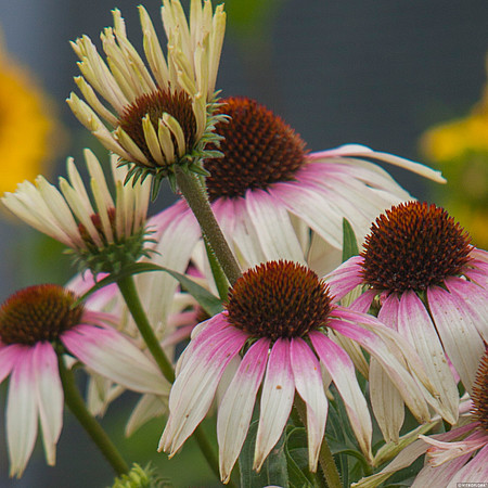 Liczne biało-różowe kwiaty na krótkich łodygach cieszą okood czerwca do września. Roślina wymaga pełnego słońca.Szczególnie piękna w grupach z innymi Jeżówkami.Wymaga przepuszczalnego podłoża, ale potrzebujewody w miesiącach letnich. Oczyszczanie roślinydopiero na wiosnę wspomoże spokojne przezimowanie