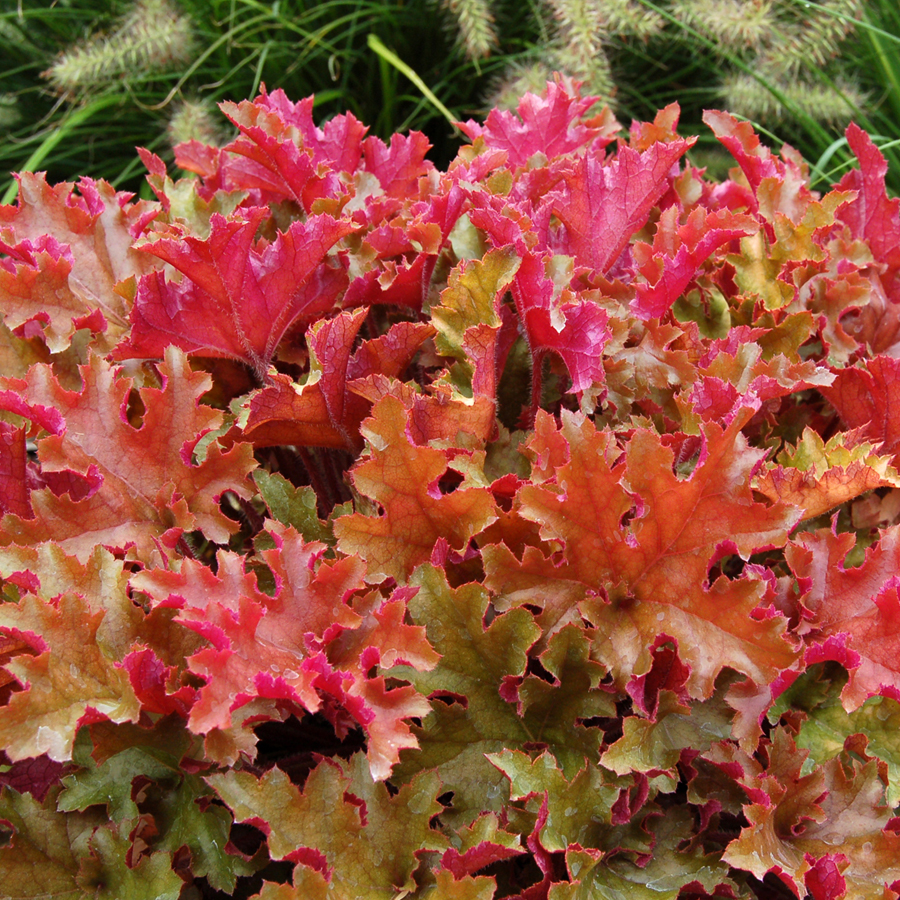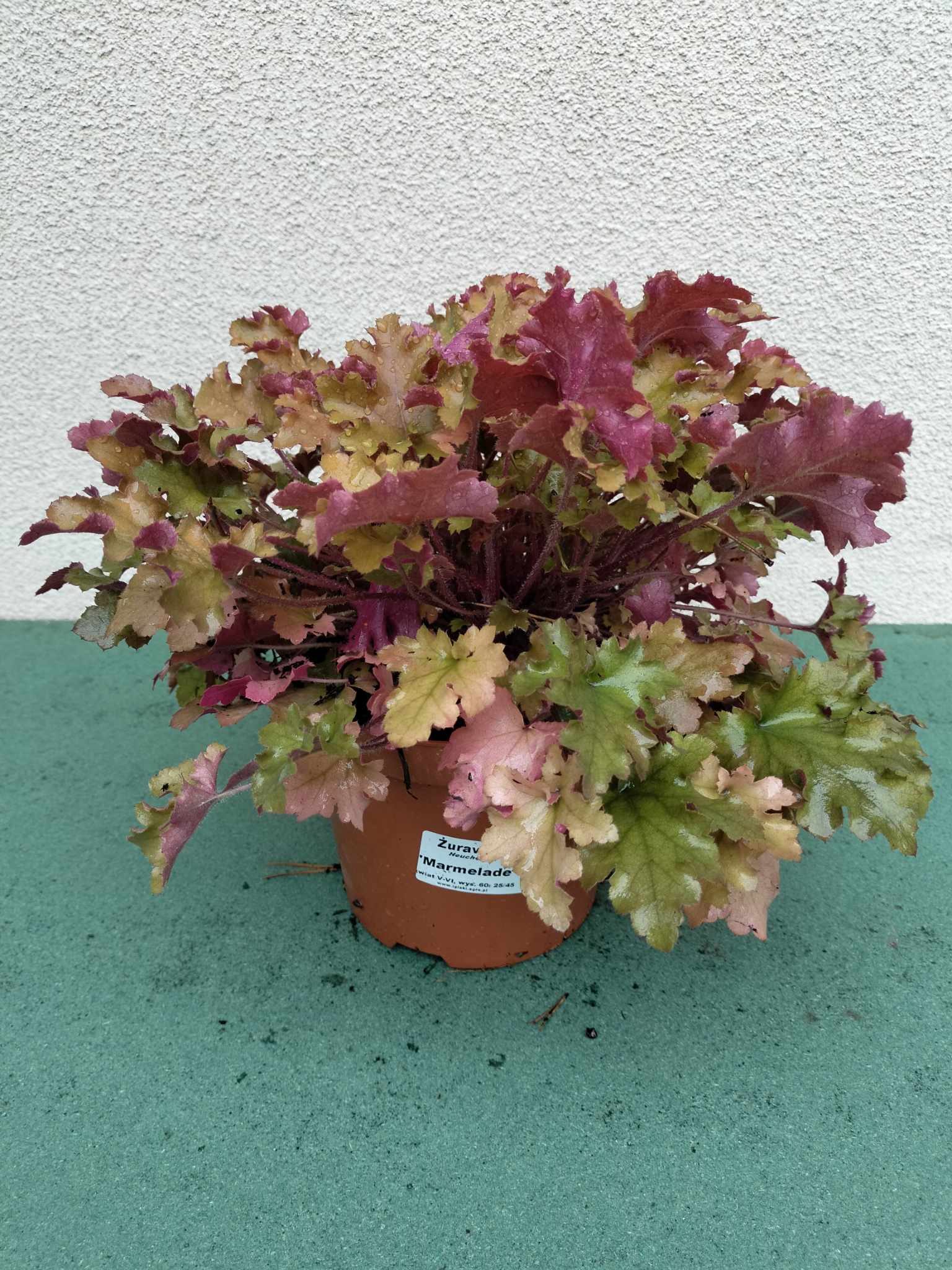 Zwarta odmiana o silnie pofałdowanych brzegach liści oraz zmiennym ubarwieniu. Najmłodsze liście mają kolor różowo-czerwony, w miarę rozwoju przechodzą w odcienie brzoskwini i bursztynu, aby w końcu stać się oliwkowo pomarańczowe. Dorasta do około 40 cm wysokości i szerokości, dzięki pięknemu pokrojowi może być świetnym urozmaiceniem wielu kompozycji. Od maja do czerwca wytwarza luźne wiechy białych kwiatostanów. Żurawka 'Marmalade' jest jedną z najstarszych kolorowych odmian dostępnych na rynku, lecz niezmiennie króluje na liście bestsellerów wśród żurawek. Dobrze toleruje nasłonecznienie.