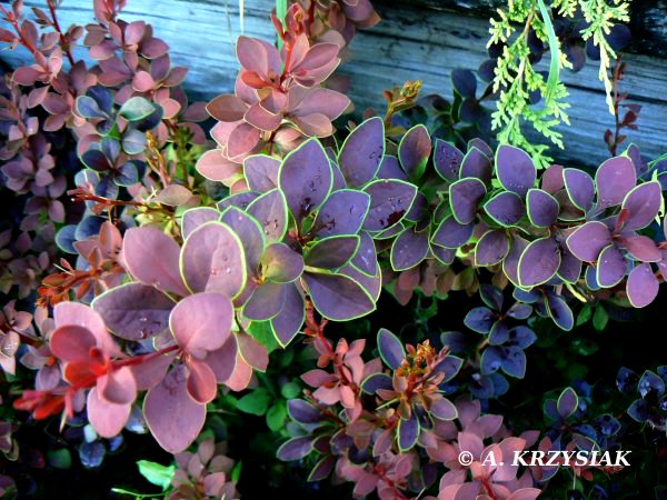 kolor liści: purpurowy z żółtą obwódką