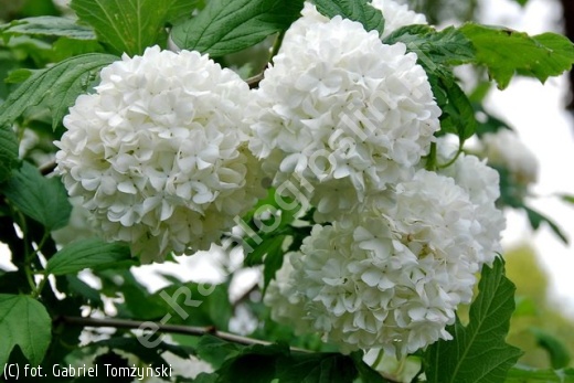 Kwitnienie przypada na maj i czerwiec. Kwiatostany początkowo są zielonkawe, następnie kremowobiałe, a w pełni rozwinięte czysto białe. Odmiana ‘Roseum’ nie zawiązuje owoców, ponieważ jej kwiaty są płonne – cała energia rośliny skupiona jest na efektownym kwitnieniu.