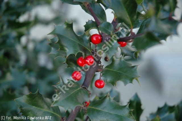 Ostrokrzew Meserve’a ‘Blue Angel’ (Ilex × meserveae) – żeńska odmiana o ciemnych liściach i czerwonych owocach
