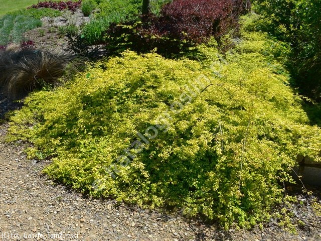 Krzew tworzy gęsty, regularny, lekko rozłożysty pokrój. Pędy są cienkie, elastyczne, dobrze się rozgałęziają. Liście są jajowate, jasnożółte do limonkowych, najlepiej wybarwione na stanowiskach słonecznych. W półcieniu barwa liści staje się bardziej zielonkawo-żółta.