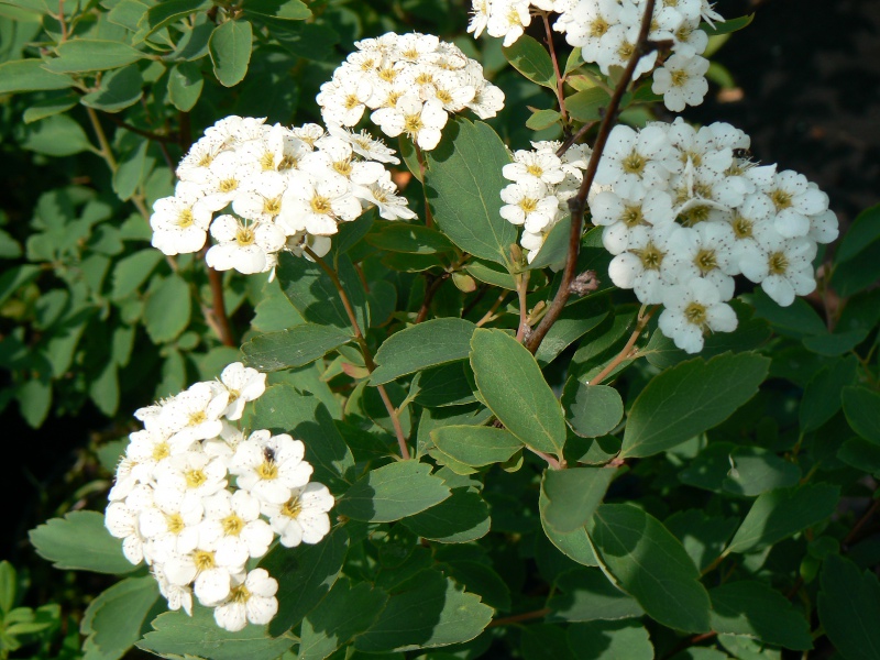 Kwiaty są drobne, czysto białe, zebrane w liczne baldachogrona, pojawiające się na zeszłorocznych pędach. Kwitnienie przypada na maj, często bardzo intensywne i równomierne. Liście są niewielkie, ciemnozielone, eleganckie, długo utrzymujące świeży wygląd; jesienią mogą lekko przebarwiać się na żółto.