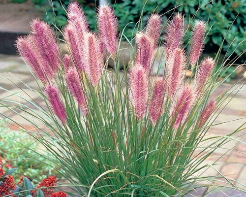 Rozplenica japońska ‘Red Head’ (Pennisetum alopecuroides) – odmiana o dużych, czerwono-purpurowych kwiatostanach